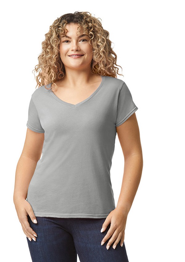 Gildan Softstyle T-shirt voor dames met korte mouw en V-hals. Het shirt heeft een hoge steekdichtheid voor een glad printoppervlak biedt, ideaal voor DTG.