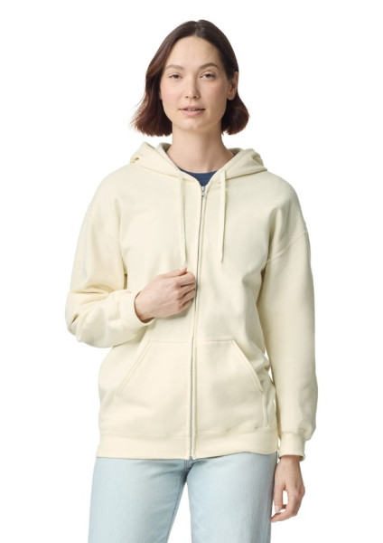 Gildan Softstyle Midweight Unisex Zip Sweater met capuchon, buidelzak en metalen rits. Met een geborstelde binnenkant met een 100% katoenen buitenkant, ideaal voor DTG-printen. Ook verkrijgbaar in een ronde hals en hoodie uitvoering