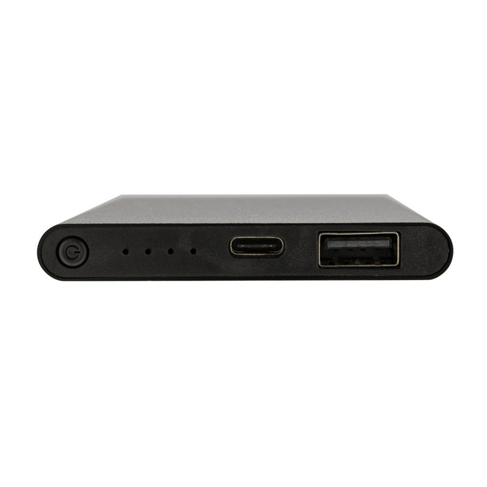 4.000 mAh powerbank met plat ontwerp, waarvan de behuizing is gemaakt van RCS-gecertificeerd gerecycled aluminium/ABS-plastic. RCS (Recycled Claim Standard) is een standaard om de gerecyclede inhoud van een product gedurende de hele toeleveringsketen te verifiëren. Totale gerecyclede inhoud: 36% op basis van het totale gewicht van het artikel. De powerbank ondersteunt opladen via zowel USB A als type C. De powerbank bevat een duurzame grade A 4.000 mAh lithium-polymeerbatterij. De energie-indicatoren geven het resterende energieniveau aan, zodat je altijd weet wanneer je moet opladen. Type-C invoer: 5V/2A; Type-C uitvoer: 5V/2A; USB A uitvoer: 5V/2A. Artikel en accessoires zijn PVC-vrij. Inclusief RCS-gecertificeerde gerecyclede TPE-oplaadkabel. Verpakt in FSC® mix verpakking