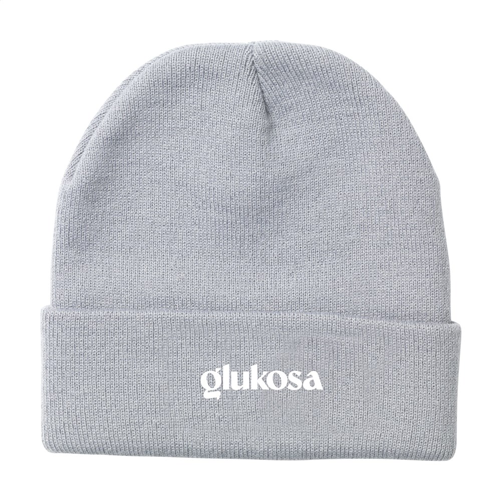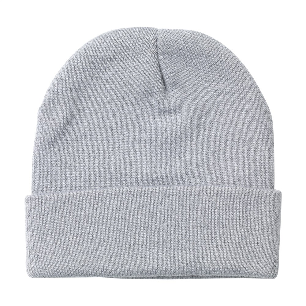 Gebreide muts met omslag. Van 100% RPET polyester. Populair, lekker warm en goede kwaliteit. One size. GRS-gecertificeerd. Totaal gerecycled materiaal: 100%.