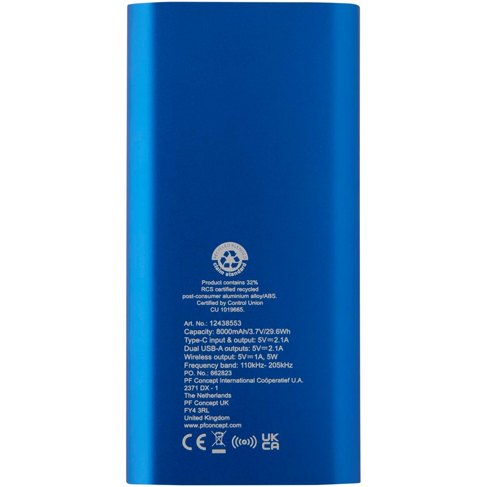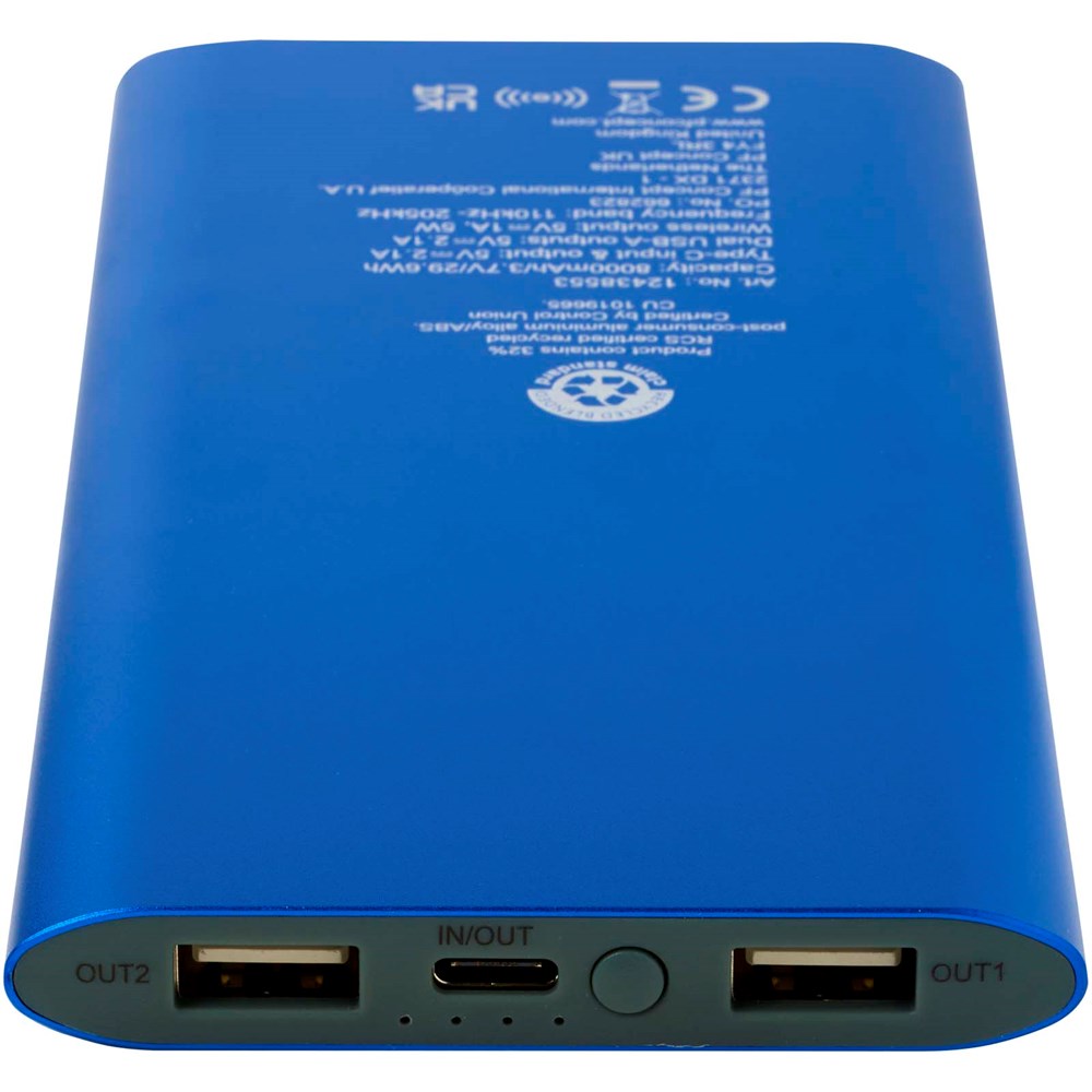 Powerbank met Type-C in/uitgangspoort en 2 x USB-A-poorten, wat betekent dat drie apparaten tegelijk kunnen worden opgeladen. Het ondersteunt ook 5 W draadloos opladen voor alle apparaten met Qi. De powerbank heeft een 8000 mAh lithium-polymeerbatterij die een totaal uitgangsvermogen levert van max. 10 W. Deze powerbank is gemaakt van 28% RCS gecertificeerd gerecycled plastic. Geleverd met een TPE Type-C naar USB-A-oplaadkabel.