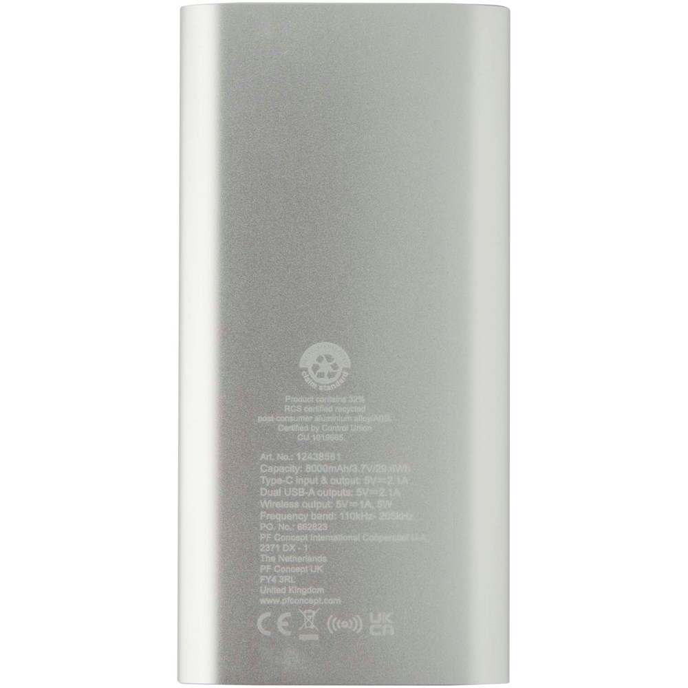 Powerbank met Type-C in/uitgangspoort en 2 x USB-A-poorten, wat betekent dat drie apparaten tegelijk kunnen worden opgeladen. Het ondersteunt ook 5 W draadloos opladen voor alle apparaten met Qi. De powerbank heeft een 8000 mAh lithium-polymeerbatterij die een totaal uitgangsvermogen levert van max. 10 W. Deze powerbank is gemaakt van 28% RCS gecertificeerd gerecycled plastic. Geleverd met een TPE Type-C naar USB-A-oplaadkabel.