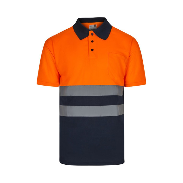 Bird-eye polo met korte mouwen (140g/m²) van polyester (100%). Contrasterende knopen en geribde kraag. Reflecterende strepen op de borst en één borstzak. Product in overeenstemming met EU-verordening 2016/425, gecertificeerd door EN20471 en klasse Nº 1. Maat: S, M, L, XL, 2XL, 3XL