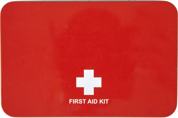 15-Delige EHBO set in metalen cassette, bestaande uit een schaar, vochtig doekje, tape, 4 alcoholdoekjes, 5 pleisters, 1 verband en 1 antiseptic doekje. Dit product mag alleen worden verkocht en geleverd binnen de Europese Unie.