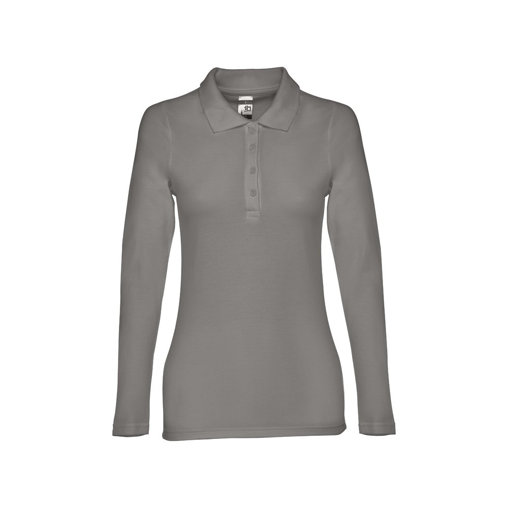 Dames poloshirt met lange mouwen van 100% gekaard piqué katoen (210 g/m²) (kleur 183: 85% katoen/15% viscose). Ribkraag versterkt met piqué gebreid lint. Bevat een verstevigde sluiting met 4 bijpassende knopen (extra knoop in de binnenzoom). Gesneden en genaaid stuk met mouwen met dubbele zoom. Met een verwijderbaar etiket. Maten: S, M, L, XL, XXL