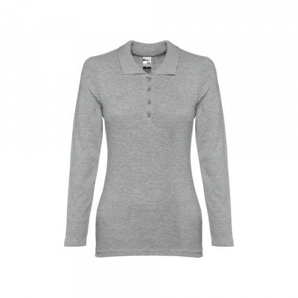Dames poloshirt met lange mouwen van 100% gekaard piqué katoen (210 g/m²) (kleur 183: 85% katoen/15% viscose). Ribkraag versterkt met piqué gebreid lint. Bevat een verstevigde sluiting met 4 bijpassende knopen (extra knoop in de binnenzoom). Gesneden en genaaid stuk met mouwen met dubbele zoom. Met een verwijderbaar etiket. Maten: S, M, L, XL, XXL