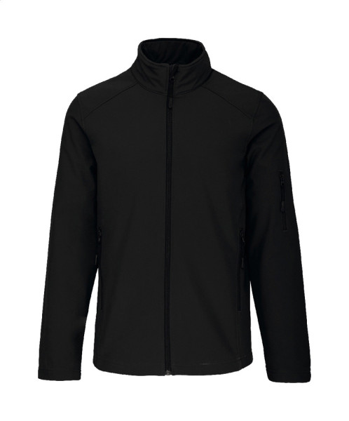 Drielaags, ademend, wind- en waterdicht softshell-jasje met ritssluiting, mouw met ritssluiting en zijzakken. Met ademende middenlaag en micropolaire fleece binnenlaag. 95% polyester en 5% elastaan, 300 g/m². Product van het merk Kariban.