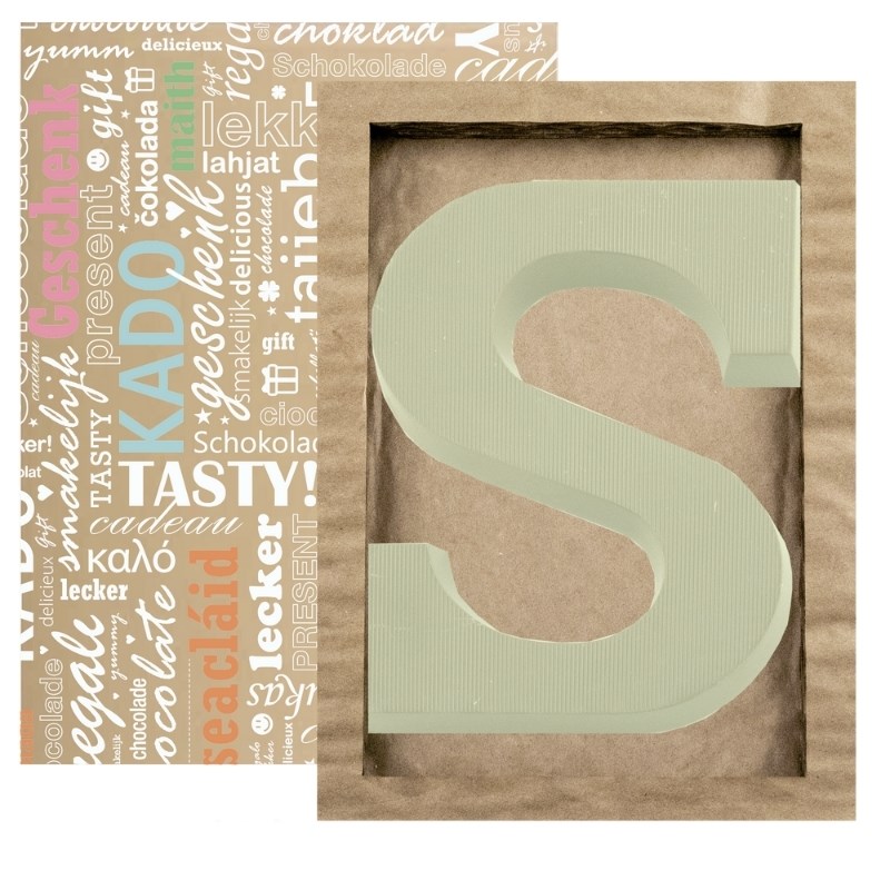 De meest milieubewuste witte chocolade Sinterklaasletter; in de gehele verpakking is geen plastic of kunststoffolie verwerkt, maar uitsluitend gebruik gemaakt van papier en karton.