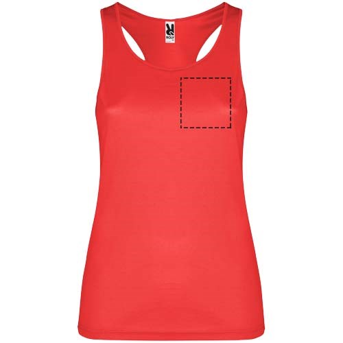 Technische, ademende, gemakkelijk te wassen en te drogen stof. Geribde armsgaten en halslijn. Racerback en zijnaden. Verwijderbaar label.