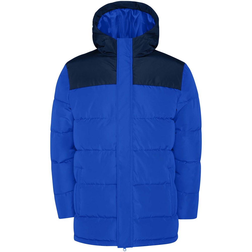 Gewatteerd jack met vaste capuchon. Rits aan de voorkant bedekt met een sluiting. Kinbescherming. Twee zijzakken met rits. Elastische manchetten.