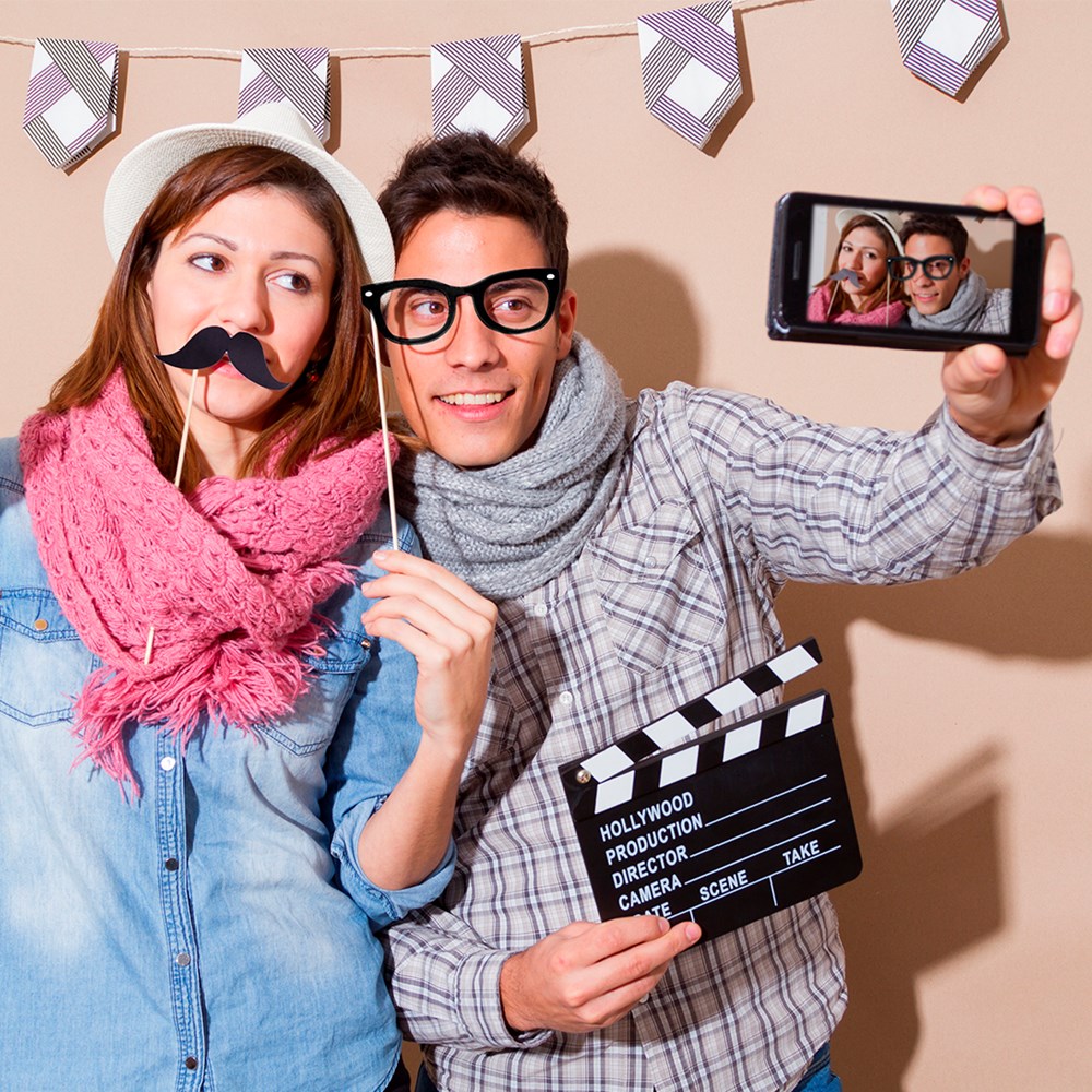 Selfie set van 5 stuks met vrolijke accessoires hoed, pijp, snor, strik en bril. Hoog grams...meer