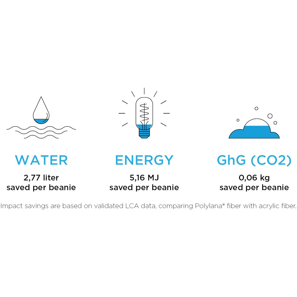 De Hale beanie is gemaakt van Polylana® vezel - een milieuvriendelijk alternatief voor 100% acryl- en wolvezels - waardoor water en energie worden bespaard en de CO2-uitstoot tijdens het productie- en verfproces wordt verminderd. In vergelijking met acrylvezel wordt voor elke Hale beanie de volgende besparing gerealiseerd: 2,77 liter water, 5,16 MJ energie en 0,06 kg GhG (CO2). De impactbesparingen zijn gebaseerd op gevalideerde Life Cycle Assessment (LCA) gegevens. Gemaakt van 1x1 ribbreisel met Polylana® vezel en acryl met een dichtheid van 12 gauge. De ideale keuze voor mensen die waarde hechten aan mode en tegelijkertijd zorg willen dragen voor het milieu.