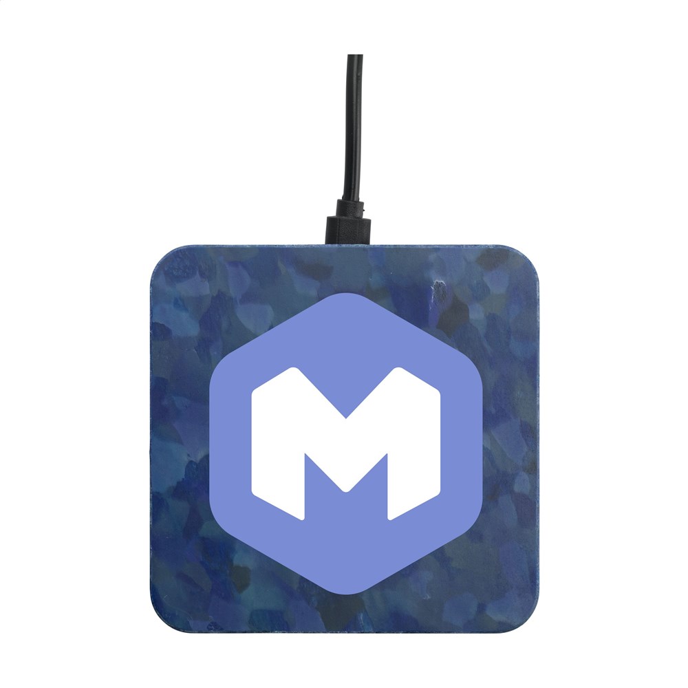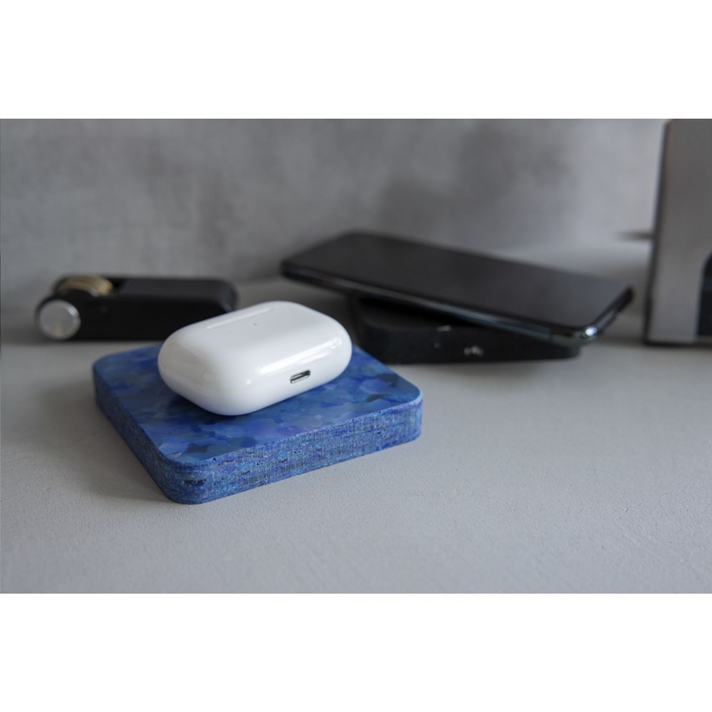 Deze draadloze 10W telefoonoplader is gemaakt van oude blauwe printer spoelen. Het plastic wordt schoongemaakt, versnipperd en dan tot platen gegoten en geperst. Uit deze platen worden de docks gefreesd. Elk product heeft zijn eigen unieke patroon. Inclusief micro-USB oplaadkabel en USB-C connector. Per stuk in kraft doos.