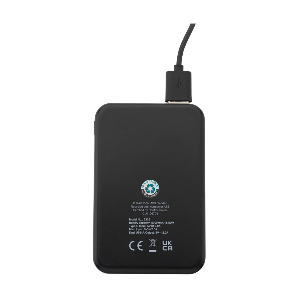 Compacte, krachtige powerbank met een ingebouwde Li-ion Polymer batterij (5.000 mAh). De behuizing is gemaakt van gerecycled ABS. Voorzien van 2 USB-A-poorten en USB-C-aansluiting. Input: Type C-5V/2.0A. Output: Dual USB-A-DC5V/2.1A. Wireless Output: 5W. Compatibel met alle mobiele apparaten die QI draadloos laden ondersteunen. Met indicatielampjes en aan-/uitknop. Inclusief USB-C oplaadkabel en gebruiksaanwijzing. RCS-gecertificeerd. Totaal gerecycled materiaal: 26%. Per stuk verpakt.