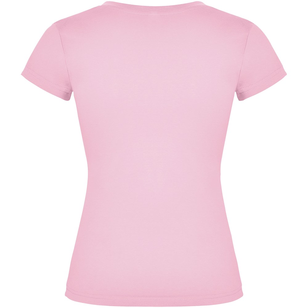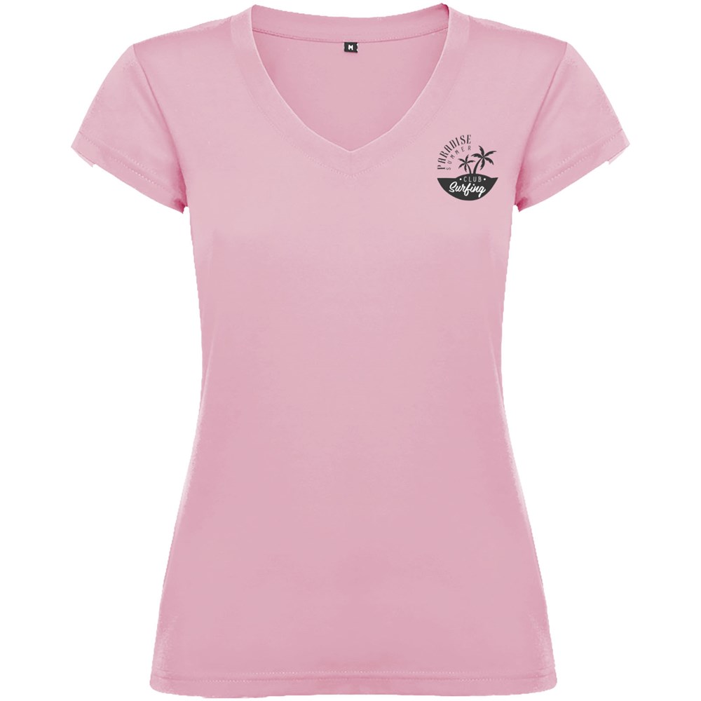 T-shirt met korte mouwen en V-hals voor dames, met 1x1 geribbelde afwerkingen. Slim-fit met zijnaden. Verwijderbaar etiket. Het model is 174 cm en draagt maat S.
