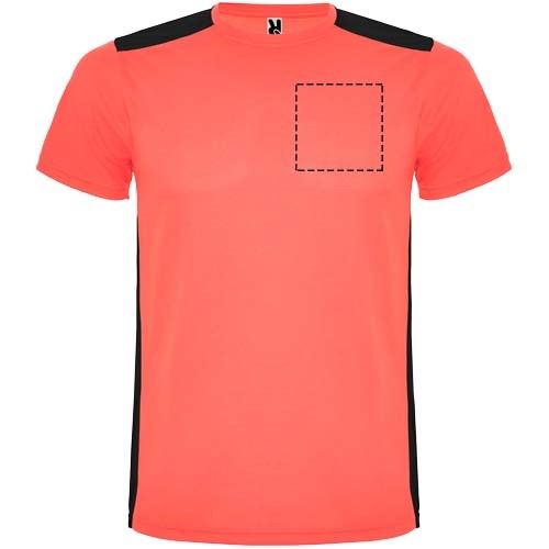 Gemakkelijk drogende, technische en ademende stof. Ronde hals. Combinatie van twee polyesterstoffen op de rug en schouders. Birdseye-stof aan de voorkant en ademende 3D-meshstof aan de achterkant. Stof voorbereid voor vochtopname. Decoratieve zigzagsteek aan de zijkanten en schouders. Rugpatroon is iets langer. Verwijderbaar label.