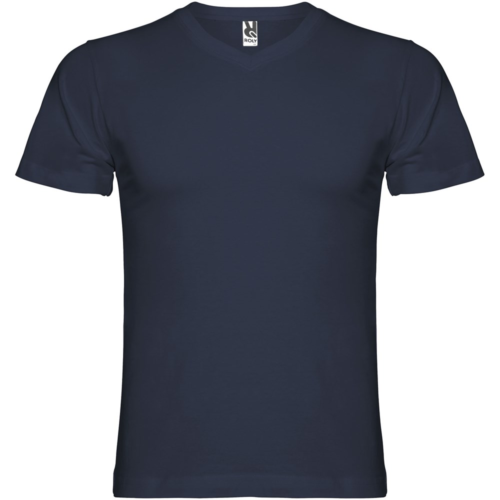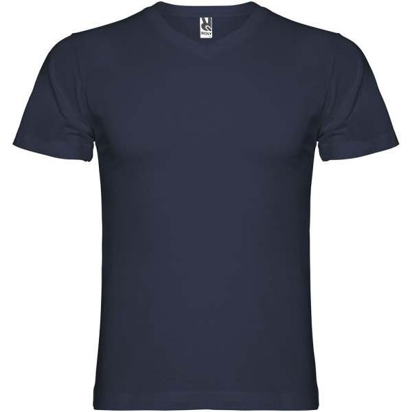 Buisvormig T-shirt met korte mouwen en tweelaags V-hals. Versterkte bedekte naden in kraag en schouders. Verwijderbaar etiket. Het model is 190 cm en draagt maat L.