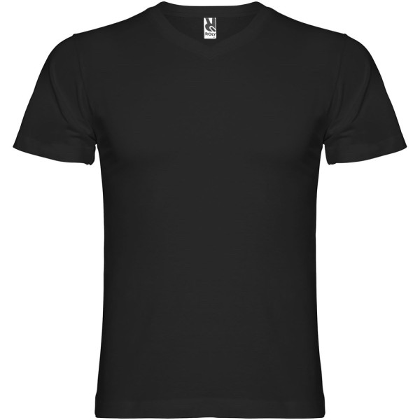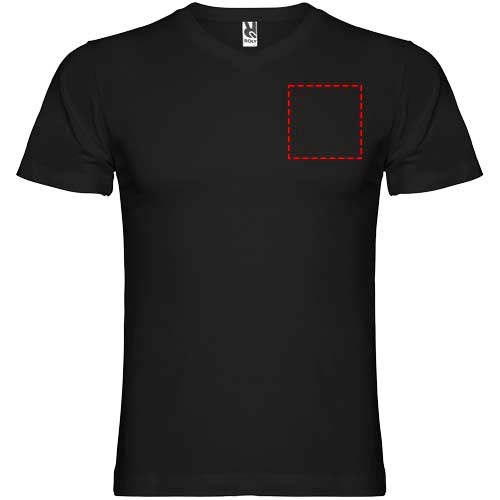 Buisvormig T-shirt met korte mouwen en tweelaags V-hals. Versterkte bedekte naden in kraag en schouders. Verwijderbaar etiket. Het model is 190 cm en draagt maat L.