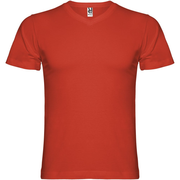 Buisvormig T-shirt met korte mouwen en tweelaags V-hals. Versterkte bedekte naden in kraag en schouders. Verwijderbaar etiket. Het model is 190 cm en draagt maat L.