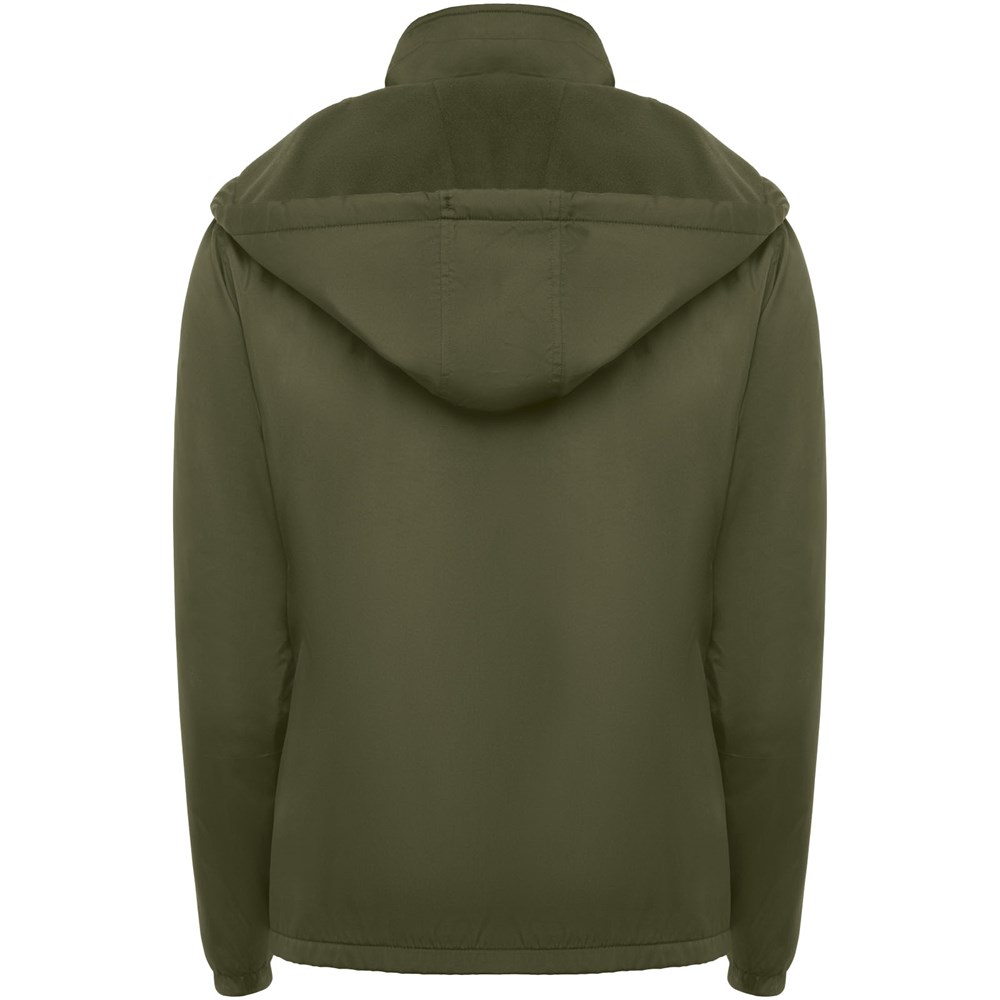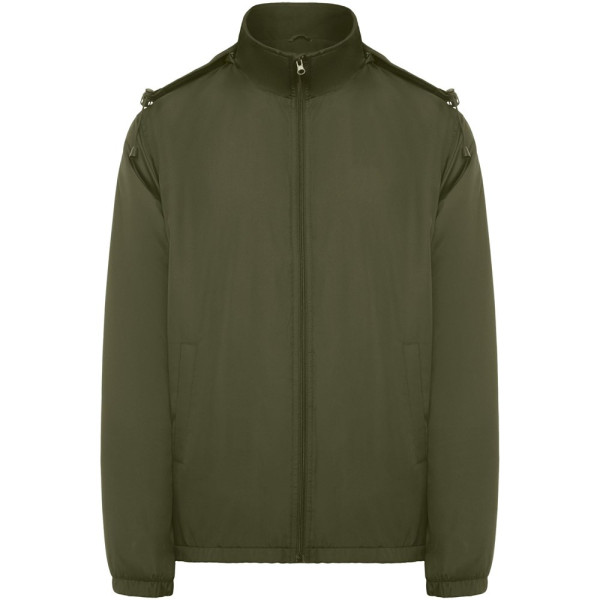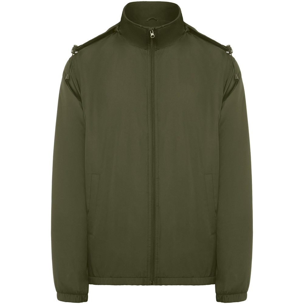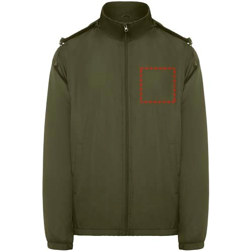 Licht waterdicht jack. Hoge kraag en opvouwbare capuchon met verstelmogelijkheden. Voering van microfleece. Rits aan de voorkant en kinbeschermer. Elastische manchetten. Twee zijzakken met ritssluiting. Binnenzak links op de borst. Verwijderbaar etiket. Waterbestendig. Winddicht. Het mannelijke model is 184 cm en draagt maat L en het vrouwelijke model is 174 cm en draagt maat S.