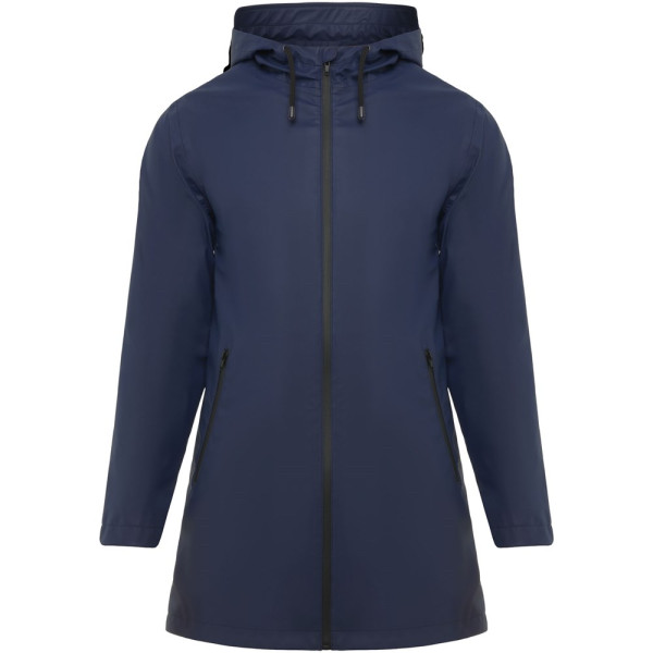 Waterdichte regenjas voor dames. Capuchon met klep. Door hitte gesealde ritsen en naden. Contrasterende details in zwart. Twee zijzakken met rits. Split aan de achterkant. Verwijderbaar etiket. Waterbestendig. Het model is 179 cm en draagt maat S.