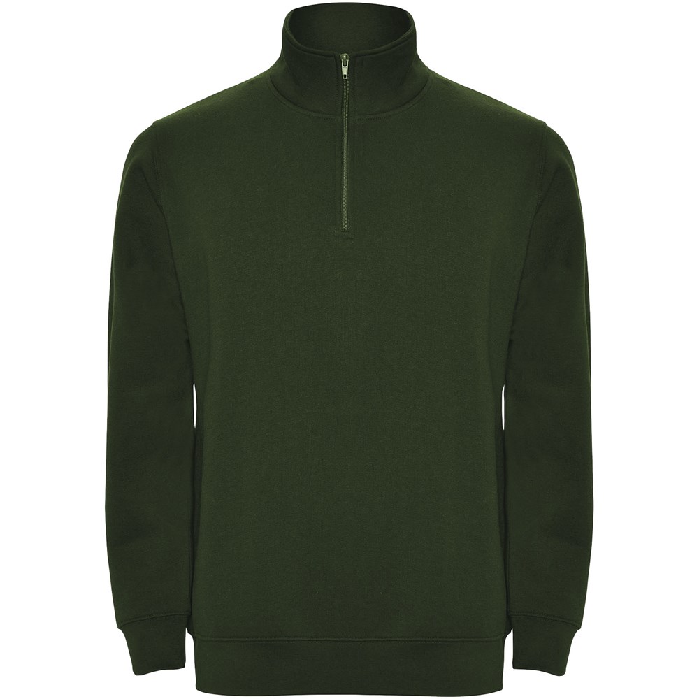 Sweatshirt met halve rits in dezelfde kleur en staande kraag. Binnenkant van de kraag in dezelfde kleur. Versterkte naadafdekkingen aan de binnenzijde van de kraag. Manchetten en tailleband in ribboord 1x1. Het model is 185 cm en draagt maat M.