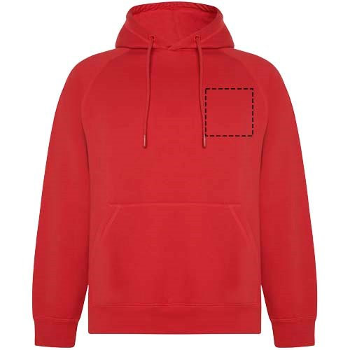 Unisex hoodie van biologisch katoen en gerecycled polyester. Kangoeroezak. Enkele jersey voering in capuchon. Rond verstelbaar trekkoord en geborduurde oogjes. Manchetten en tailleband van 2x1 geribde stof. Verwijderbaar etiket. Individuele gerecyclede verpakking. Het mannelijke model is 185 cm en draagt maat L en het vrouwelijke model is 168 cm en draagt maat S.