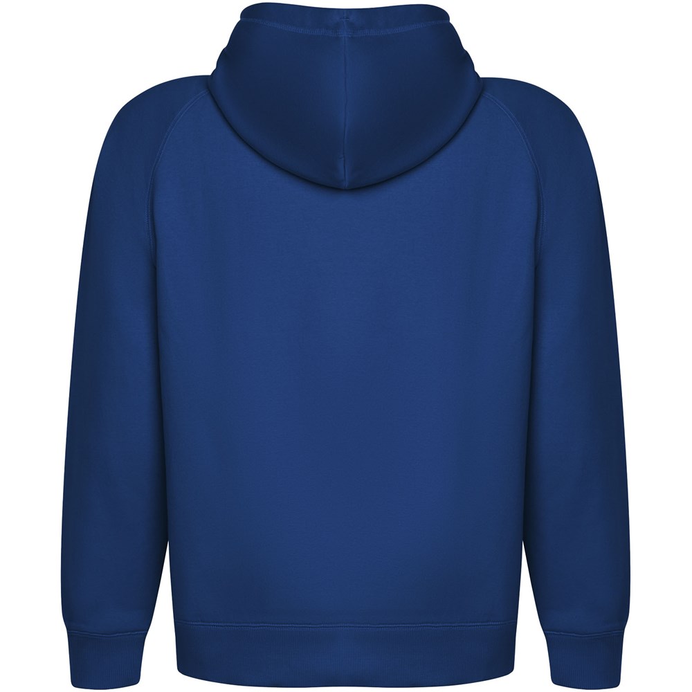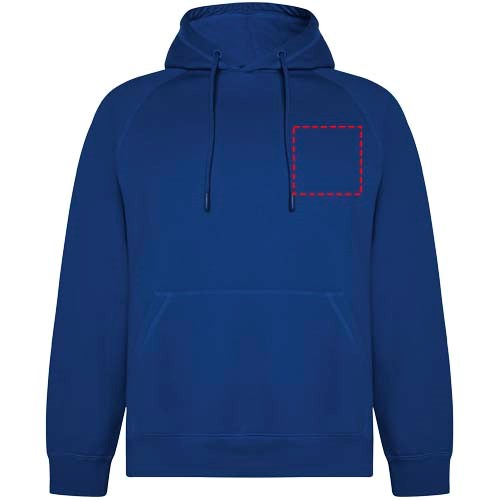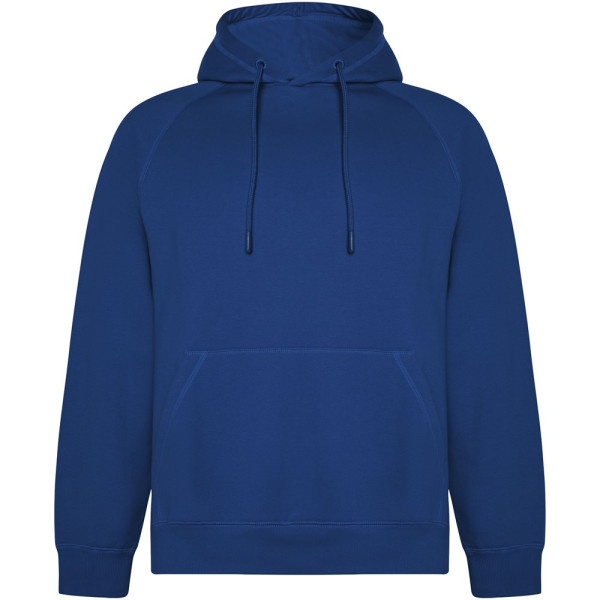 Unisex hoodie van biologisch katoen en gerecycled polyester. Kangoeroezak. Enkele jersey voering in capuchon. Rond verstelbaar trekkoord en geborduurde oogjes. Manchetten en tailleband van 2x1 geribde stof. Verwijderbaar etiket. Individuele gerecyclede verpakking. Het mannelijke model is 185 cm en draagt maat L en het vrouwelijke model is 168 cm en draagt maat S.