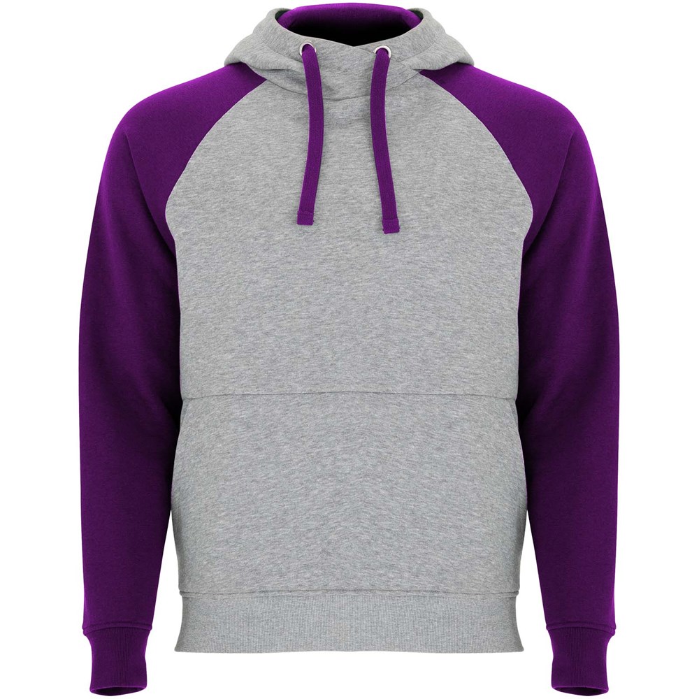Tweekleurige unisex hoodie. Capuchon met gekruiste hals en metalen oogjes. Contrasterende binnenkant van de capuchon, trekkoord en raglanmouwen. Kangoeroezak. Manchetten en zoom van 1x1 ribgebreid elastaan. Verwijderbaar label.