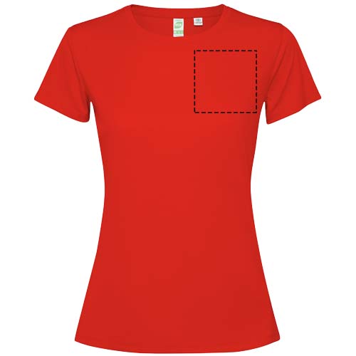 Getailleerd technisch T-shirt met korte mouwen voor dames. Kraag met bijpassende naden. De zoom aan de achterkant is iets langer dan aan de voorkant. Zijnaden naar voren verschoven.