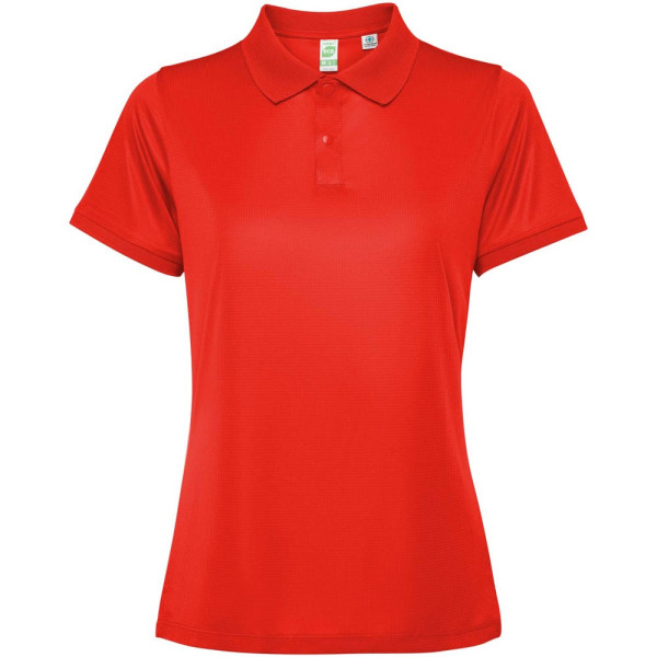 Getailleerde damespolo met korte mouwen. Versterkte bedekte naden in de binnenkraag. 1x1 geribde manchetten en kraag. Zijnaden. Knoopsluiting met 3 knopen en zijsplitten.