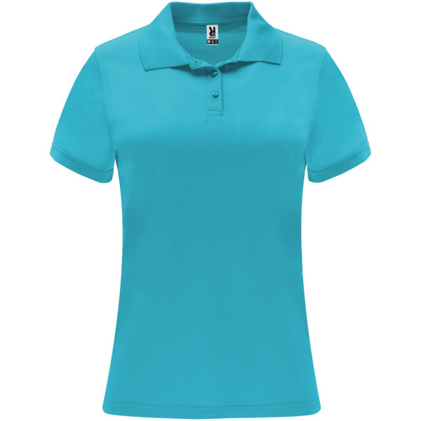 Technisch poloshirt met korte mouwen voor dames. Gebreide kraag met sluiting met drie knopen. Getailleerde snit. Ademende, gemakkelijk wasbare en droge stof. Verwijderbaar etiket. Technische stof. Ademende stof. Het model is 173 cm en draagt maat S.