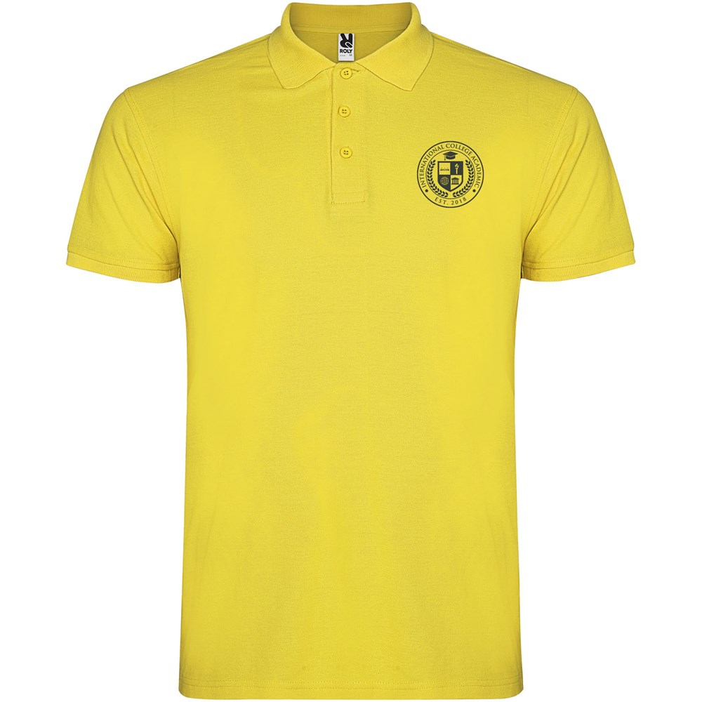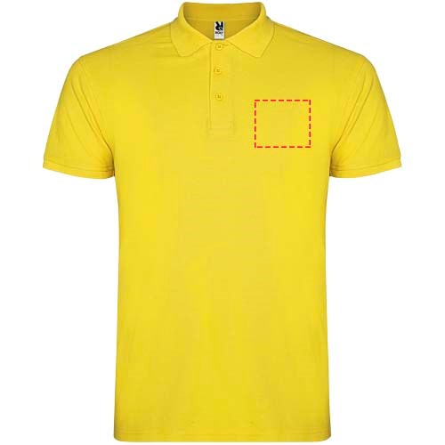 Poloshirt met korte mouwen voor kinderen. Versterkte bedekte naden in de binnenkant van de kraag. 1x1 geribde manchetten en kraag. Zijnaden. Knoopsluiting met drie knopen en zijsplitten. Optionele zak. Verwijderbaar etiket. Het model is 124 cm en draagt maat 5/6.