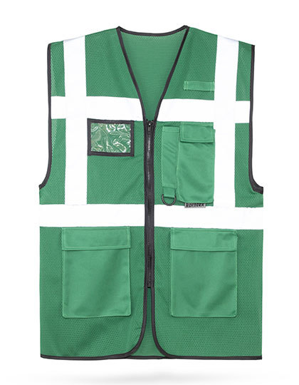 Multifunctioneel vest uit gaas met hoge zichtbaarheid, ritssluiting en zakken | Comfortabel, zelfs bij hoge temperaturen, dankzij de netstof en een losse pasvorm | Twee reflecterende strepen rond het lichaam en over de schouders, elk 5 cm breed, voor goede zichtbaarheid | Met verschillende zakken en een D-ring | Gecertificeerd volgens EN ISO 20471