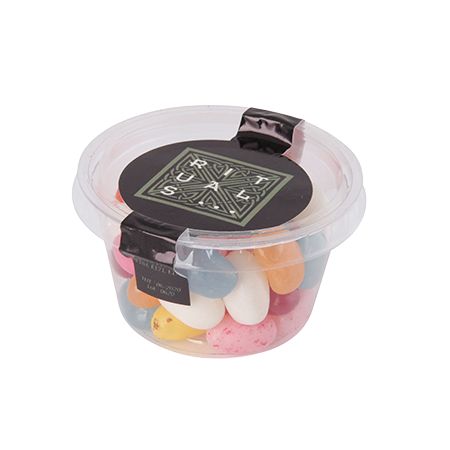 Transparant Biodegradable bakje met los deksel Ø 70 x 41 mm., gevuld met 60 gr. chococarletties of jelly beans