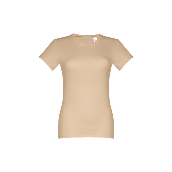 Getailleerd 100% gekaard katoenen jersey dames T-shirt (190 g/m²) (kleur 183: 90% katoen en 10% viscose). Bevat dunne jersey kraag met satijnen verstevigingslint. Gesneden en genaaid stuk met dubbele zoom aan de mouwen en onderkant. Maten: S, M, L, XL, XXL
