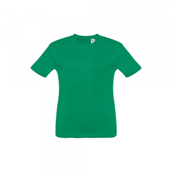 T-shirt voor kinderen (unisex). Van 100% gekaard jersey katoen (150 g/m²). Bevat een 1x1 ribkraag met tricotverstevigings biaisband. Geknipt en genaaid kledingstuk met dubbel gestikte zoom aan de mouwen en onderkant. Maten: 2, 4, 6, 8, 10, 12