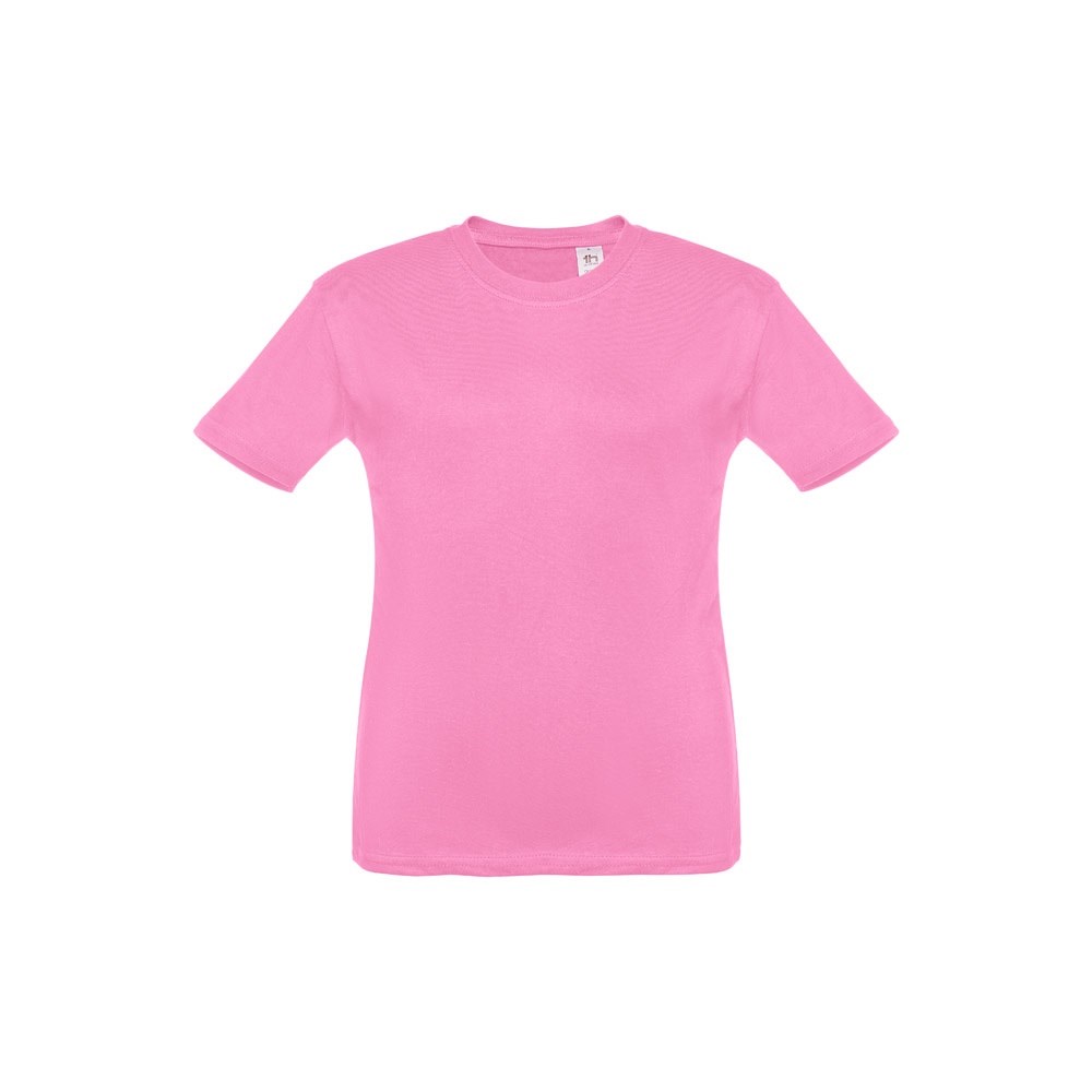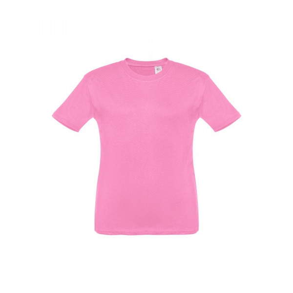 T-shirt voor kinderen (unisex). Van 100% gekaard jersey katoen (150 g/m²). Bevat een 1x1 ribkraag met tricotverstevigings biaisband. Geknipt en genaaid kledingstuk met dubbel gestikte zoom aan de mouwen en onderkant. Maten: 2, 4, 6, 8, 10, 12