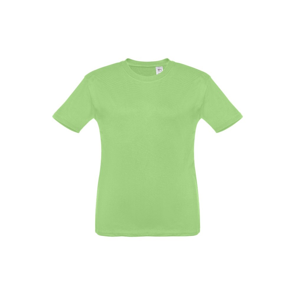 T-shirt voor kinderen (unisex). Van 100% gekaard jersey katoen (150 g/m²). Bevat een 1x1 ribkraag met tricotverstevigings biaisband. Geknipt en genaaid kledingstuk met dubbel gestikte zoom aan de mouwen en onderkant. Maten: 2, 4, 6, 8, 10, 12