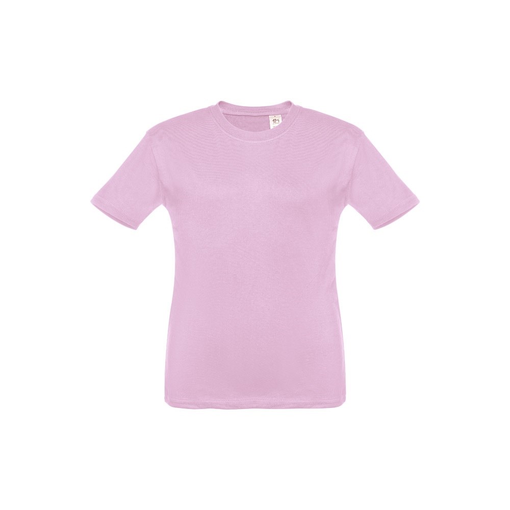 T-shirt voor kinderen (unisex). Van 100% gekaard jersey katoen (150 g/m²). Bevat een 1x1 ribkraag met tricotverstevigings biaisband. Geknipt en genaaid kledingstuk met dubbel gestikte zoom aan de mouwen en onderkant. Maten: 2, 4, 6, 8, 10, 12