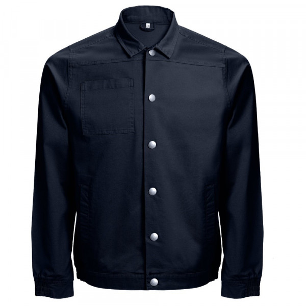 Jas van 98% katoen en 2% elastaan (240 g/m²). Modern model met 2 figuurnaden op de rug en elastiek op de pols en in de taille. Knoopsluiting door middel van drukknopen. Met 2 achterzakken en 1 borstzak. Maten: S, M, L, XL, XXL, 3XL