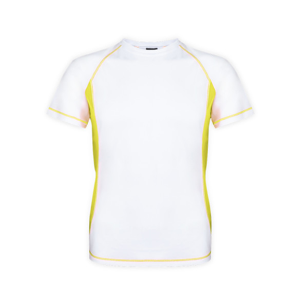 Sport T-shirt voor volwassenen van 100% ademend polyester 135 g / m2. Ontwerp in het wit met verstevigingsnaden en felgekleurde zijkanten. Verkrijgbaar in de maten S, M, L, XL, XXL.