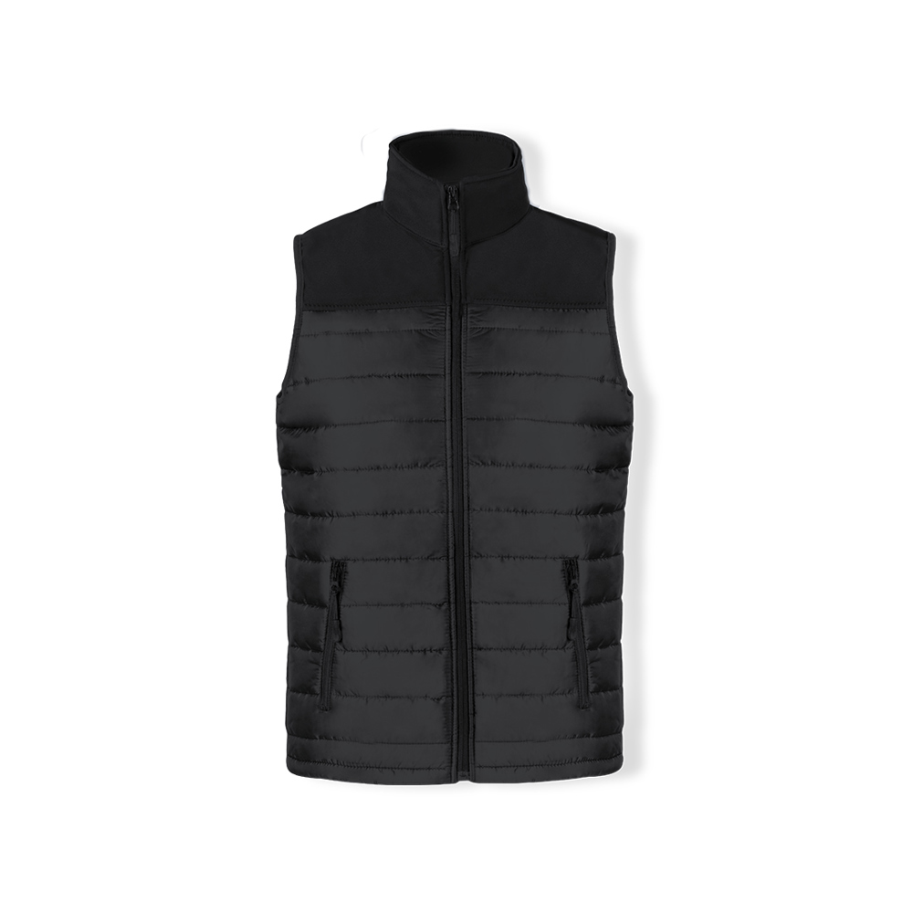 Waterdicht en ademend vest in combinatie met soft shell en polyester materialen. In een elegante zwarte kleurconstructie, met ritssluiting en zijzakken met rits, met trekkers voor gemakkelijk openen. Verkrijgbaar in de maten S, M, L, XL, XXL.
