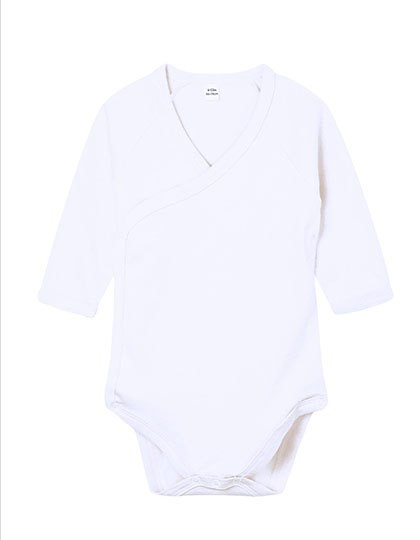 Biologische katoen, ringgesponnen en gekamd | Interlock | Overslag, bodysuit in kimonostijl | Nikkelvrije drukknopen aan de zijkant voor gemakkelijk aankleden | Nikkelvrije drukknopen aan de beenopening | Bindband rond hals, mouwuiteinden en beenopeningen voor vormbehoud | Lange raglanmouwen | Afscheurbaar maatlabel | Zorglabel met QR-code om de toeleveringsketen te volgen en de positieve impact van biologisch kopen te controleren | Zorglabel gemaakt van biologisch katoen
