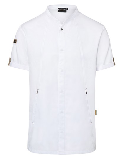 Voor: keperbinding, 150 g/m². | Achter: jersey piqué, 170 g/m², ademend, vochtregulerend | Innovatieve duurzame koksjas met korte mouwen die urban-stijl combineert met natuurlijke flair | Het product bevat 72% gerecycleerd polyester en is geproduceerd op milieuvriendelijke en sociaal verantwoorde wijze | licht op maat | Inzet van jersey piqué in de rug biedt een comfortabele ventilatie en een grotere bewegingsvrijheid | Drukknopen voor snel openen en sluiten | Zakken met rits vooraan en zak op de linkermouw | Stijlvolle toepassing van contrasterende banden op de mouwen en de halslijn voor een urban-look | Green Button-etiket, www.g-k.eu/karlowsky
