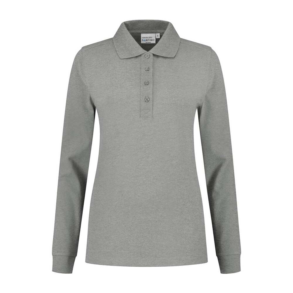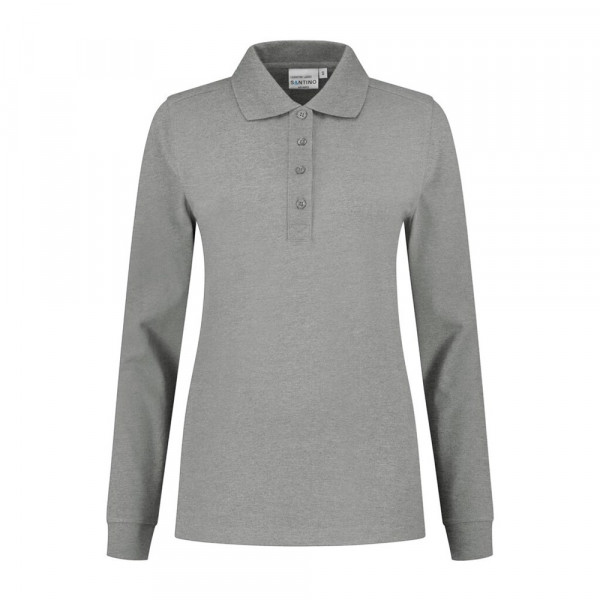 Poloshirt met lange mouw, 50% polyester / 50% lange vezel katoen, 220 gr/m², pique, ladies fit met polo-ribkraag, en 4-knoopsluiting, lange mouw met ribmanchet, 1x1 ribboord, splitjes in zijnaad, schouders voorzien van een dubbele laag stof voor extra versteviging, halve maan en anti-microbiële afwerking. (Sport grey is melange: 85% gekamd katoen / 15% viscose).