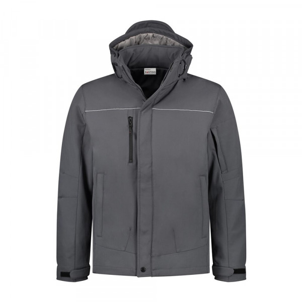 Softshell jacket, 94% polyester / 6% elastaan, 310 gr/m², 3 laags softshell, gewatteerd, regular fit met opstaande kraag, mouw met klitteband verstelbare manchetten en windvanger aan binnenzijde manchet, 2 steekzakken, borstzak en mouwzakje met YKK rits, winddicht, ademend, waterafstotend, binnenzak met rits en koptelefoonkabel doorgang, afneembare capuchon, reflectie piping op borst en rug, printersrits aan binnenzijde en onderzijde verstelbaar middels koord/stopper. (Alleen druktechnieken gebruiken die geschikt zijn voor stoffen als softshell.)