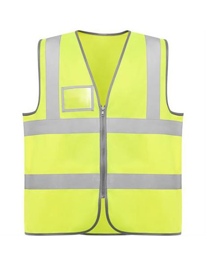 Vest met hoge zichtbaarheid en rits aan de voorkant | Twee horizontale waarschuwingsstrips op de borst en verticale strips op de schouders | Transparante zak aan de rechterkant van de borst voor ID-kaart | EU-gecertificeerd volgens EN ISO 13688:2013 en EN ISO 20471:2013/A1:2016, klasse II | Dit is een artikel over persoonlijke beschermingsmiddelen (PBM's). In overeenstemming met EU-verordening 2016/425 over persoonlijke beschermingsmiddelen is een EU-conformiteitsverklaring van de fabrikant verplicht. Deze verstrekken wij u graag op verzoek.
