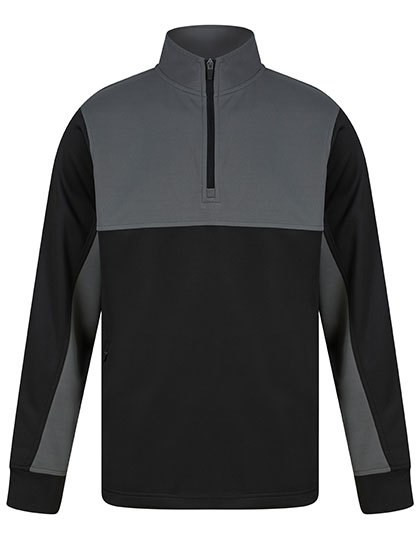 Contrasterende panelen aan de borst en armen | Kwartrits | Zijnaden | Omgekeerde nylon ritsen vooraan in het midden en aan de zijzakken | Mouw met 1×1 ribmanchet | Semi-automatische ritstrekker en -schuiver