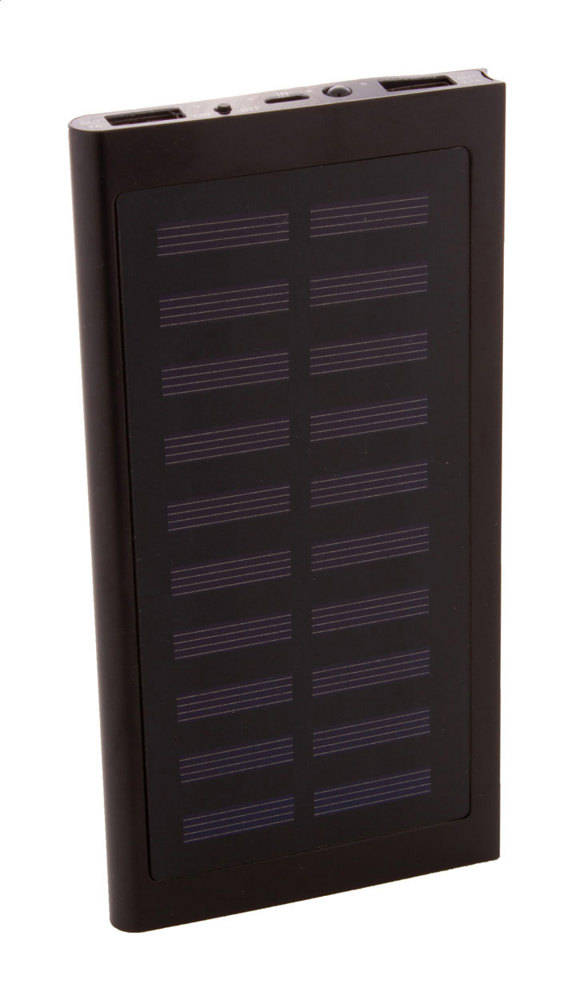 USB powerbank in gerecycled aluminium behuizing met ingebouwde zonnelader en 4000 mAh batterij. Met 2 USB- en 1 USB-C-oplaadpoorten. USB-C-invoerpoort. Inclusief USB-oplaadkabel.